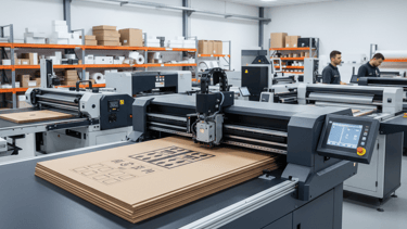 A large digital printing machine inside a room, producing a vivid banner with pink, black, and white colors. The machine has a blue exterior with multiple control buttons and switches, situated against a neutral-colored wall with a few posters and signs.